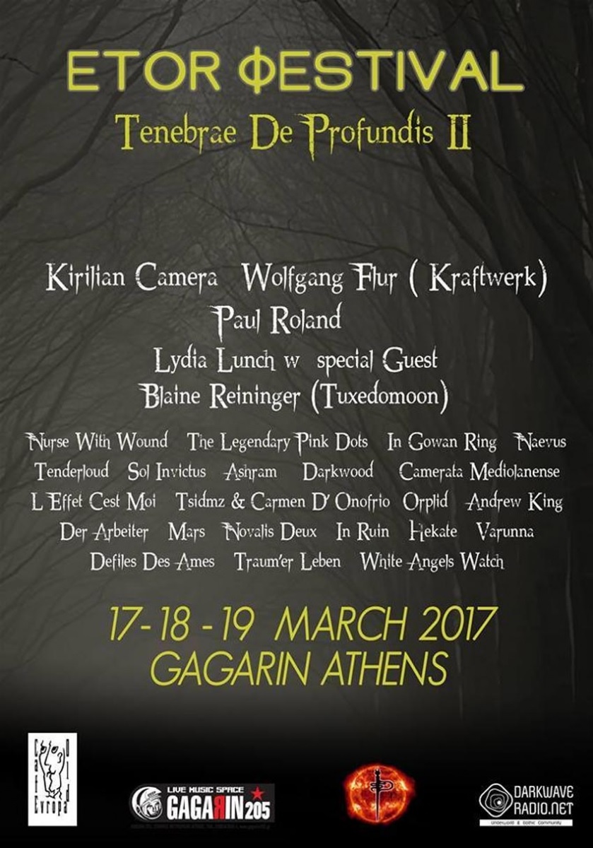 -Tenebrae de Profundis II: con tan rimbombante nombre se esconde el primer y más oscuro festival del año. Del 17 al 19 de marzo, en Atenas se podrá ver a Lydia Lunch con Blaine L. Reininger (de Tuxedomoon), a los industriales Nurse with Wound, Sol Invictus, Suicide Commando, The Legendary Pink Dots, a los italianos Kirlian Camera, Wolfgang Flur (de Kraftwerk), y al maravilloso Paul Roland. Actualización: tristemente por varias razones (entre ellas las pocas entradas anticipadas vendidas) el festival no podrá contar con ninguno de los artistas anteriormente señalados.